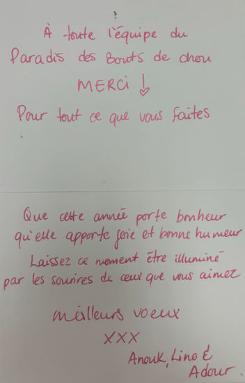 Nous partageons avec fierté les témoignages et les commentaires positifs de nos parents. Leur satisfaction et leurs retours témoignent de la qualité de notre engagement envers le bien-être et le développement des enfants. Découvrez ce que nos familles ont à dire sur leur expérience à la Garderie Le Paradis des Bouts de Chou !